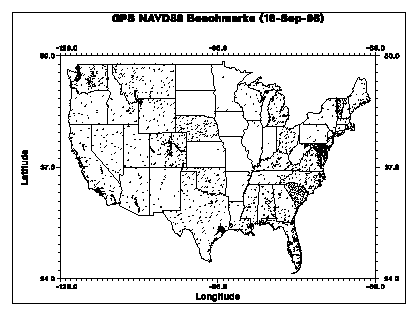 NGS is engaged in a project to establish a nationwide GPS network that is called the High Accuracy Reference Network (HARN). HARN station spacing and accuracy is variable; ranging from 25-100 km spacing, and around 1 ppm accuracy. Many of the HARN points are also NAVD 88 benchmarks. Clearly, these form a powerful data set for accuracy assessment and improvement of geoid models. Figure 2 displays the locations of 2951 points that are optically leveled benchmarks with NAVD 88 Helmert orthometric heights, and which have GPS measured ellipsoidal heights in the NAD 83 (86) reference system as of September 1996. The irregular distribution illustrates the state-by-state approach to the surveying, and the different levels of state participation. Further detail on the HARN's can be found in Bodnar (1990), Milbert and Milbert (1994), and Milbert (1995). It must be emphasized that the HARN ellipsoidal heights are not as accurate as one would expect from continuously operating GPS receivers.