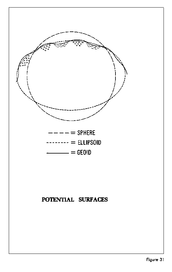 The uneven distribution of the earth's mass causes the force of gravity to vary from point to point on the surface and in external space. While force of gravity is measured at points on the surface with highly sensitive instruments, mathematical procedures are required to analyze orbital perturbations and to express the gravitational potential. The gravitational potential may be explained in terms of potential surfaces-surface to which the force of gravity is always perpen- dicular. If the earth were a perfect non-rotating sphere with homogeneous mass distribution, the potential surface would be spherical in shape. The fact that the earth is shaped more like an ellipsoid than a sphere causes the potential surface to be shaped more like an ellipsoid. Actually, the earth is neither spherical nor ellipsoidal. The potential surface bulges where there is excessive mass and it is depressed in areas of mass deficiency. The undulating surface described earlier as the geoid is a potential surface of the real earth. The diagram in Figure 31 illustrates the three surfaces just discussed.