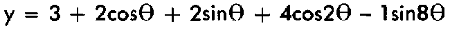 which describes the curve shown in Figure A-1. Its first term, which is its constant term, is 3. Thus 3 is the mean value of the curve. The second term, y = 2cos(Theta), is a harmonic of period 360(Degree), because after this period it repeats itself. Its amplitude is 2, the largest value for y this term can attain. The third term, y = 2sin(Theta), traces the same curve as y = 2cos(Theta) except that it is 90(Degree) out of phase, or shifted 90(Degree). The term y = 4cos2(Theta) has an amplitude of 4 and a frequency of 2. The frequency of 2 means that the curve for this term repeats itself twice every 360(Degree). The last term, y = -1sin8(Theta), has an amplitude of -1 and a frequency of 8. The negative constant indicates that the curve for this term will start on the negative side of y = 0, rather than on the positive side. Graphs of the harmonic terms are shown in Figure A-2.