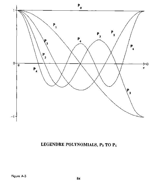 Graphs of these polynomials up to n = 4 are shown in Figure A-3. Another form of spherical harmonics are the associated Legendre functions, P(subnm)(cos(Theta)), where m, a nonnegative integer smaller than or equal to n, is the order of the function. When m = 0, this function becomes P(subn0)(cos(Theta)), or simply the Legendre polynomial P(subn)(cos(Theta)).
