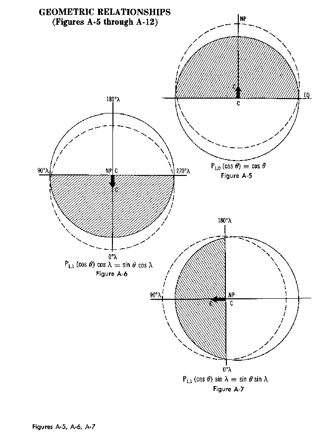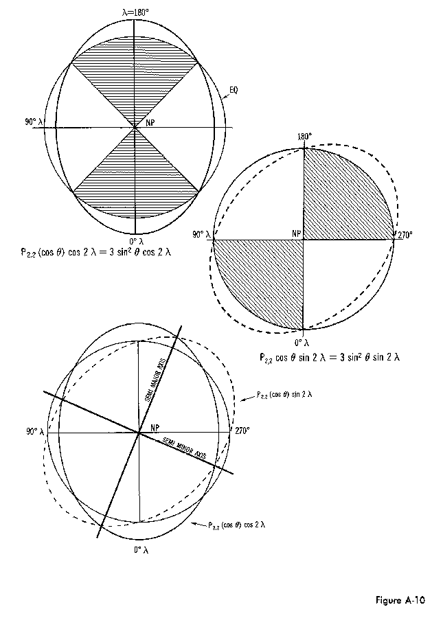 Figure A-5 shows a geometric representation of the harmonic term P(sub10)(cos(Theta)). The solid circle represents the mean value and the dashed curve is the value of the potential when only the mean value term and the term under consideration are combined. Thus, the dashed curve shows the effect of an individual term. The hachured part of the figure indicates the area of the sphere where the harmonic is positive; and the non-hachured part indicates where the harmonic is negative.